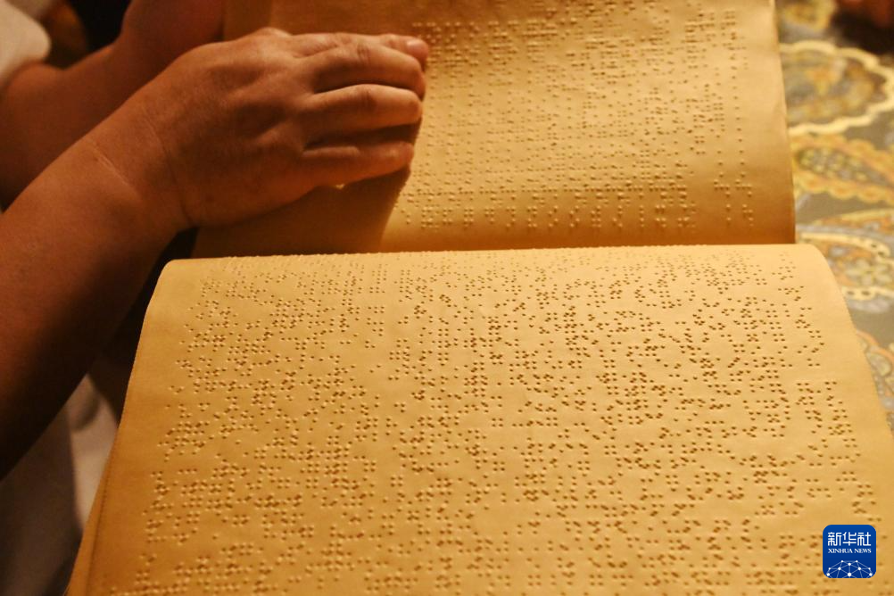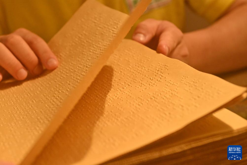 4月22日,在广西南宁市明秀东路的盲人读书角,视障人士曾桥明在阅读盲文书籍。