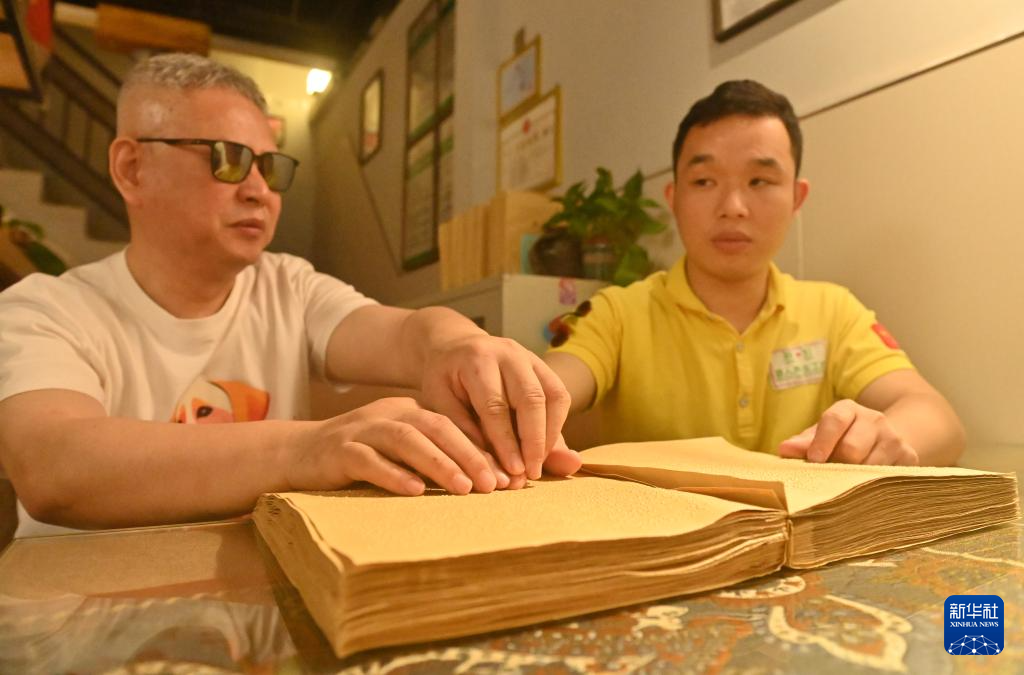 4月22日,在广西南宁市明秀东路的盲人读书角,视障人士曾桥明(右)在广西盲人协会主席陶进指导下学习盲文知识。