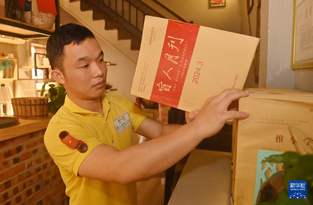 4月22日,在广西南宁市明秀东路的盲人读书角,视障人士曾桥明学习后将书放回原处。