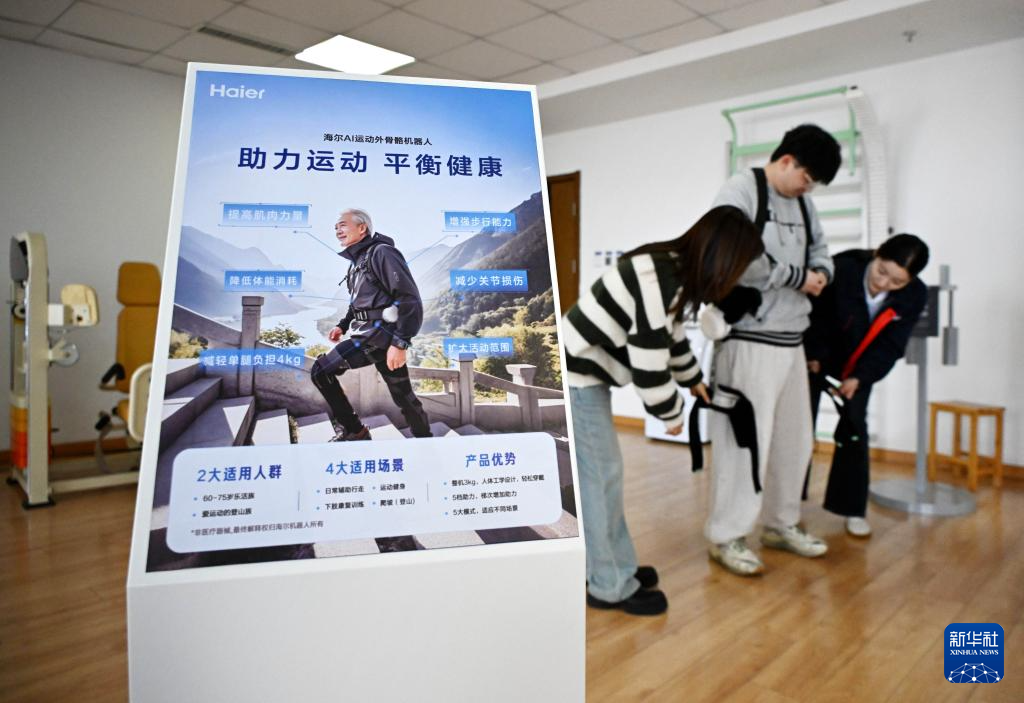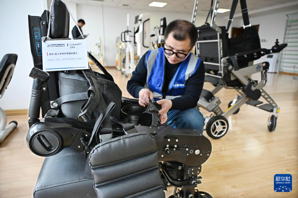 4月9日,在青岛市康养领域具身机器人暨智能康复类产品训练验证中心,训练师在穿戴外骨骼机器人准备训练。