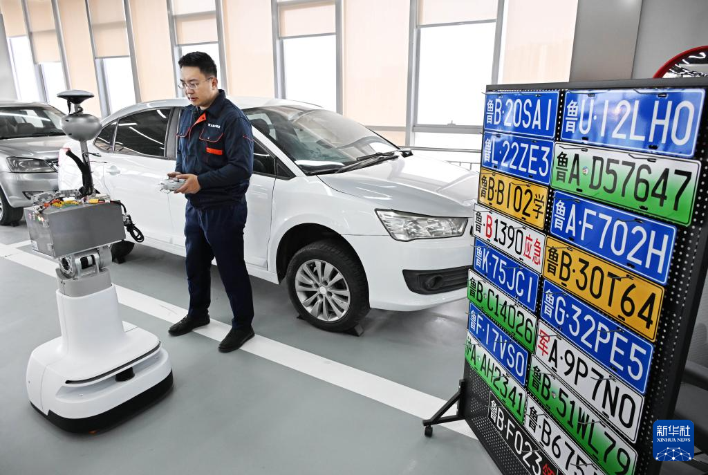 4月22日,在青岛市具身智能机器人公共训练场,训练师周东在停车场场景内指导机器人训练。