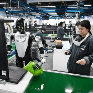 3月23日,在青岛市人形机器人数据采集训练场,训练师在快递物流场景内指导机器人进行训练。