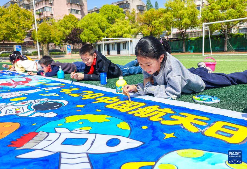4月24日,江苏省扬州市江都区龙川小学学生在绘制航天主题长卷。