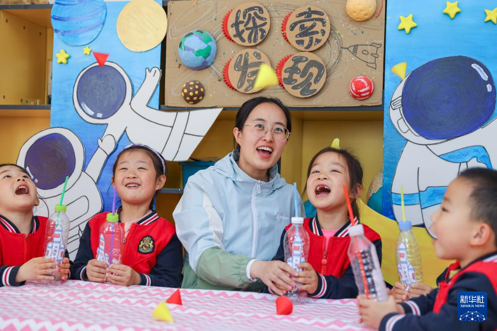 4月24日,在山东省青岛市李沧区青峰路幼儿园开展的航天科普活动中,老师指导小朋友进行“火箭发射”小实验。
