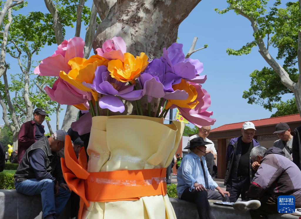 4月24日,在上海市中山公园,人们在装点着花朵置景的大树旁下棋。