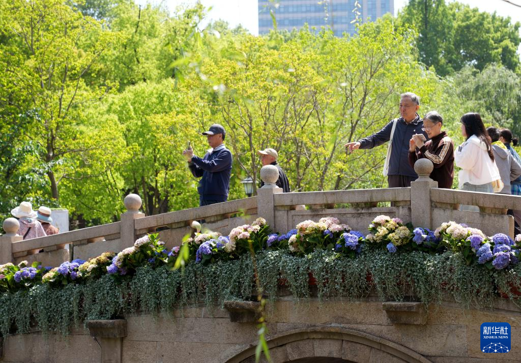 4月24日拍摄的被鲜花装点的上海中山公园十二景点之一“虹桥蒸雪”。