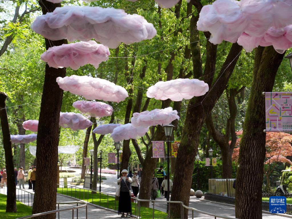 4月24日,在上海市长宁区的苏州河步道,人们在形似云霞的置景下拍照。
