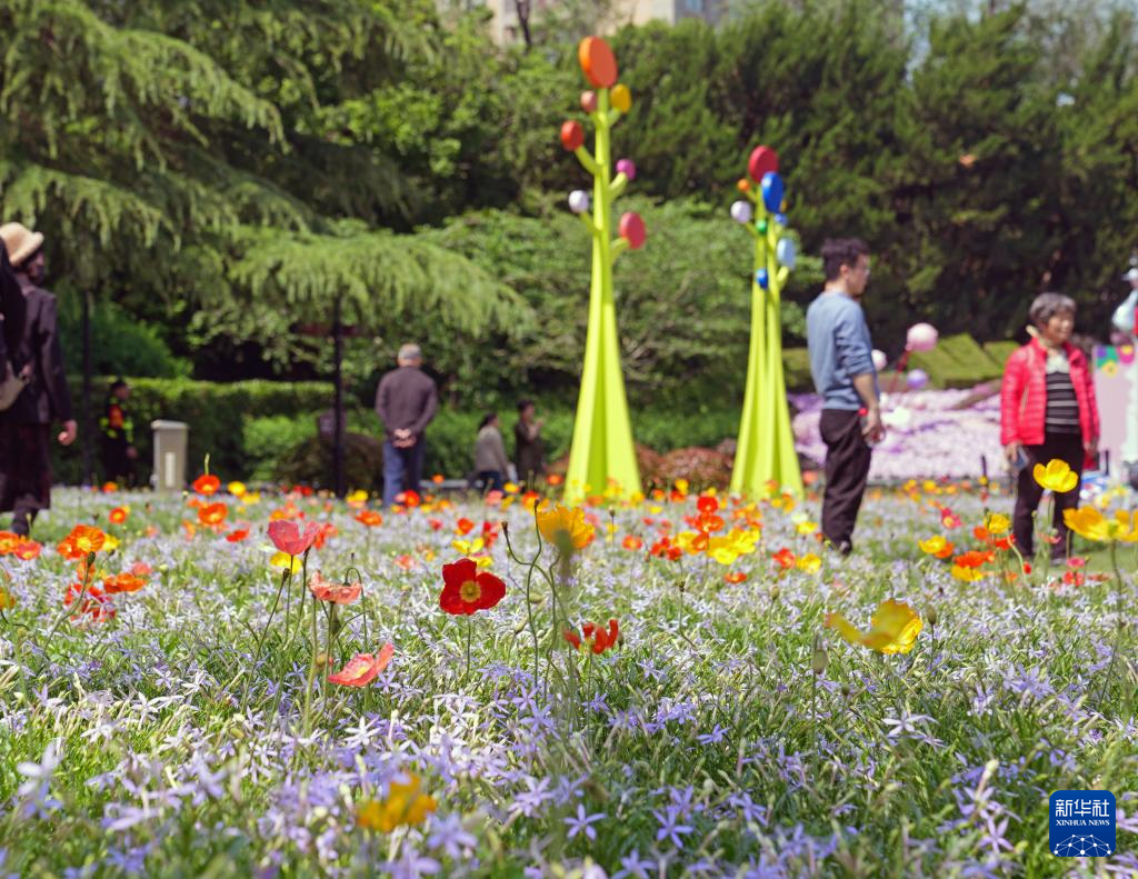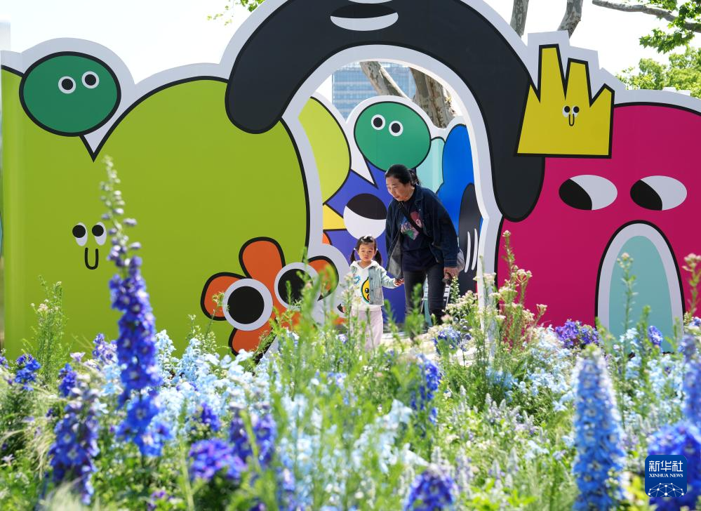 4月24日,在上海市中山公园,人们在花卉置景前游玩。