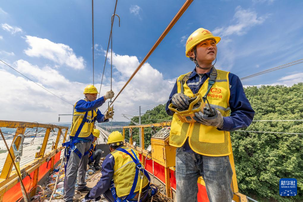 4月28日,现场作业人员进行接触网导线架设起锚作业。