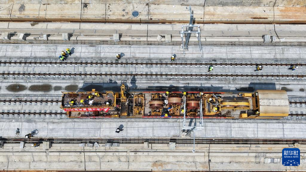4月28日,施工人员在恒张力架线车上对接触网导线进行临时固定作业(无人机照片)。