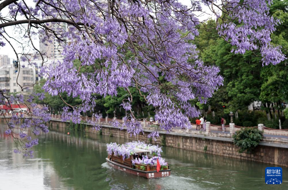 连日来,云南省昆明市教场中路、盘龙江畔的蓝花楹竞相绽放,吸引众多市民和游客前来打卡拍照,共赴紫色花海之约。