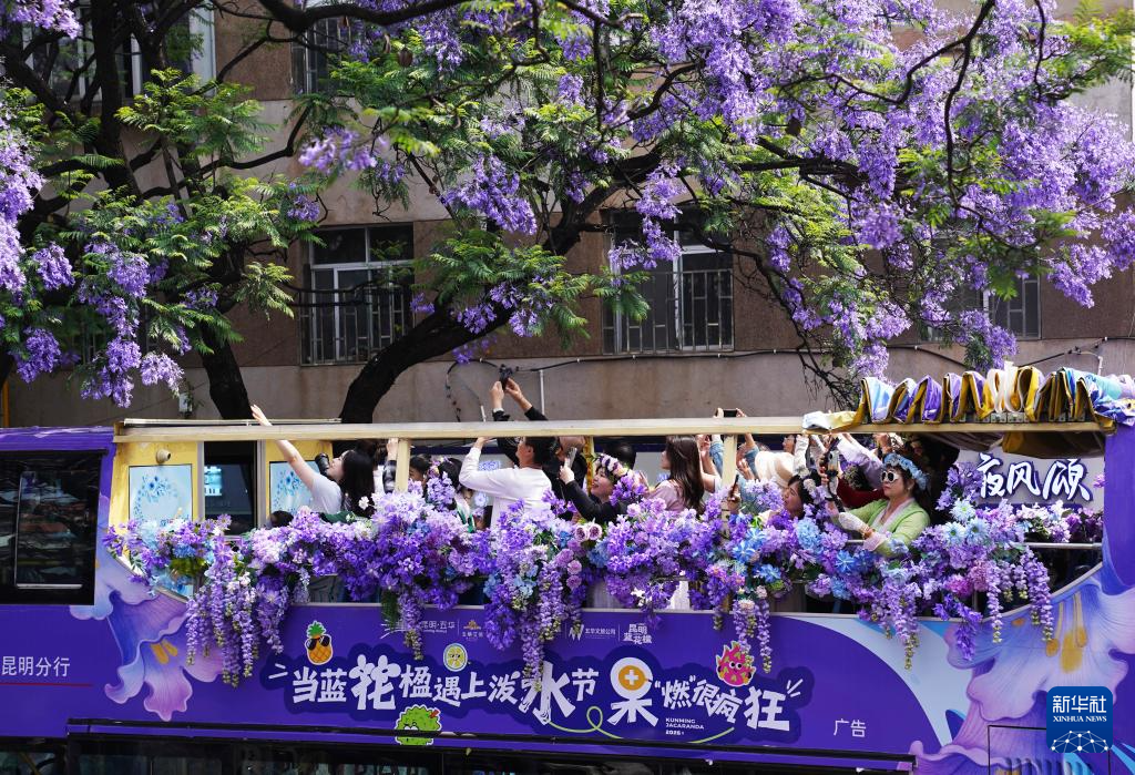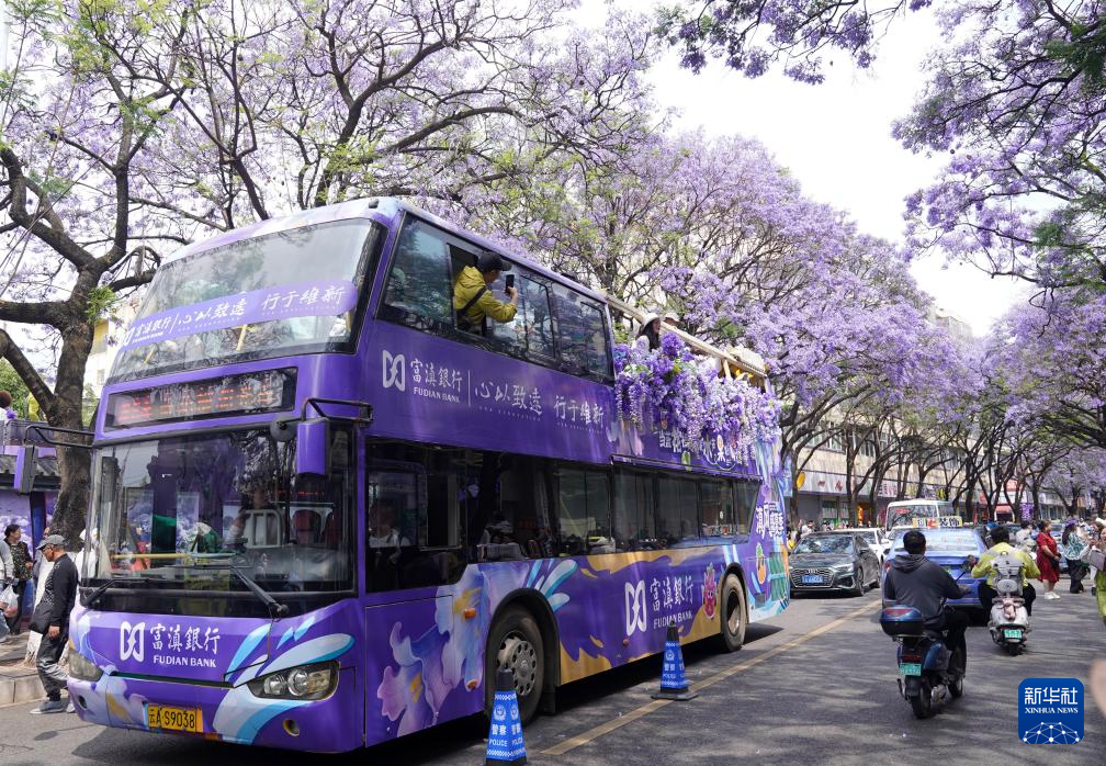 4月26日,游客乘坐蓝花楹观光巴士经过昆明市教场中路。