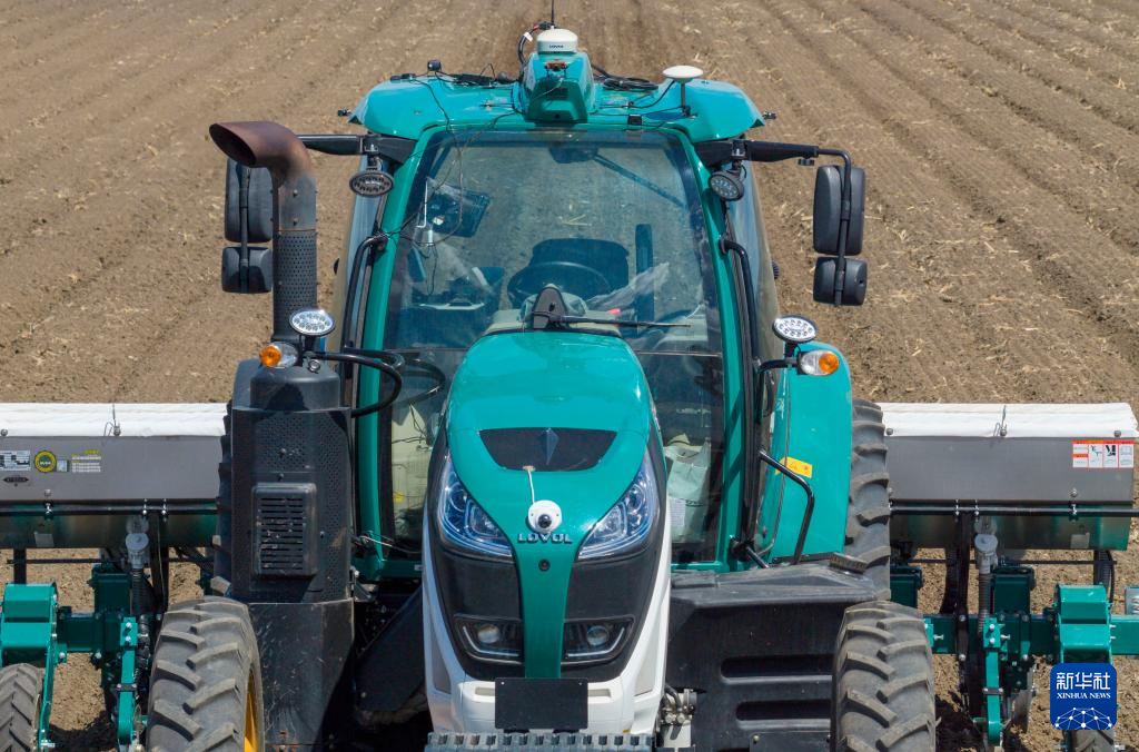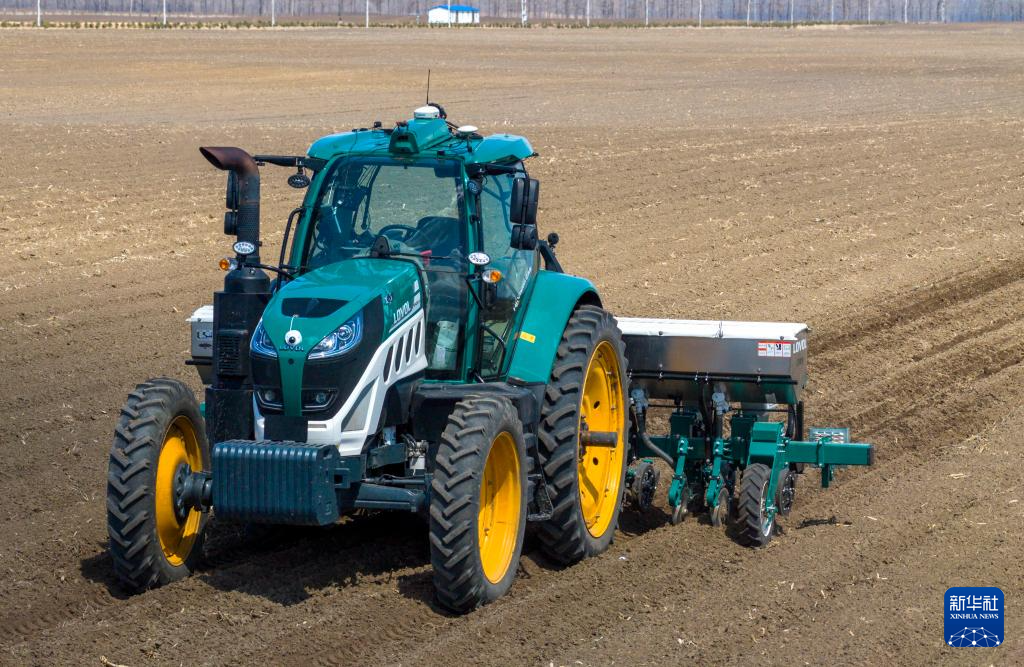 4月28日,北大荒集团黑龙江友谊农场有限公司一旱田地块上,大马力智能农业机械在进行播种作业。