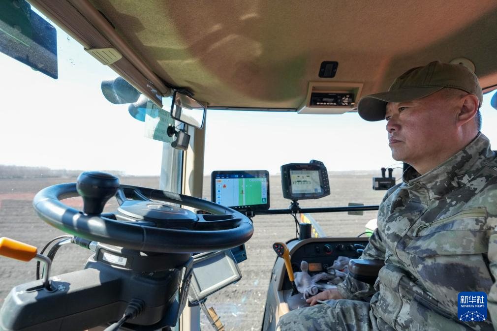 4月28日,北大荒集团黑龙江友谊农场有限公司第四管理区,农户在大马力智能农业机械驾驶室中监测设备运行情况。