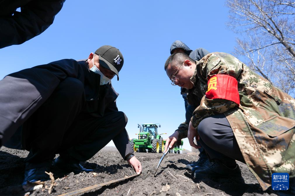 4月28日,在北大荒集团黑龙江友谊农场有限公司第四管理区,农技人员按照种植规程要求检查播种质量。