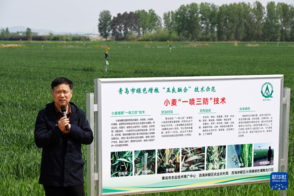 在青岛市西海岸新区大场镇绿色增粮先行区麦田里,青岛市农技中心植保部农艺师王连刚在介绍小麦“一喷三防”技术(4月28日摄)。