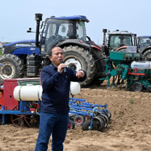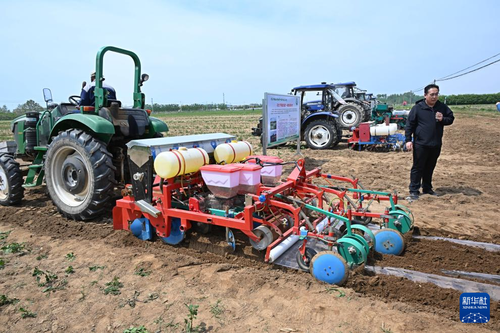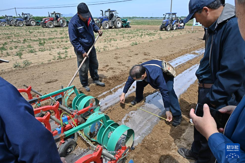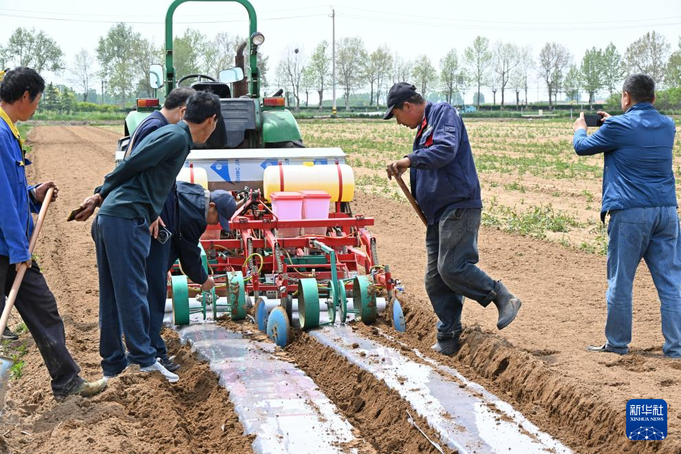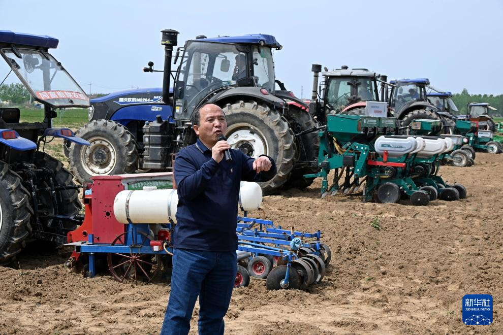 在青岛市西海岸新区大场镇绿色增粮先行区农田里,农技人员在推广花生“两选四适”一播全苗技术(4月28日摄)。