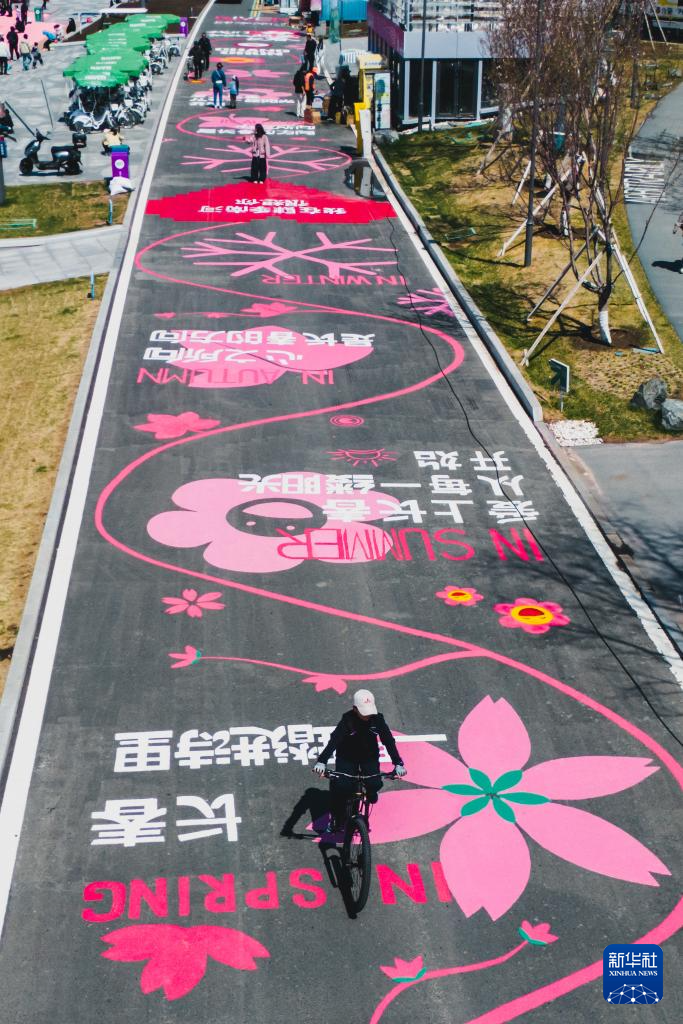 4月26日,市民在吉林省长春市肆季南河岸线公园骑行(无人机照片)。
