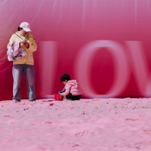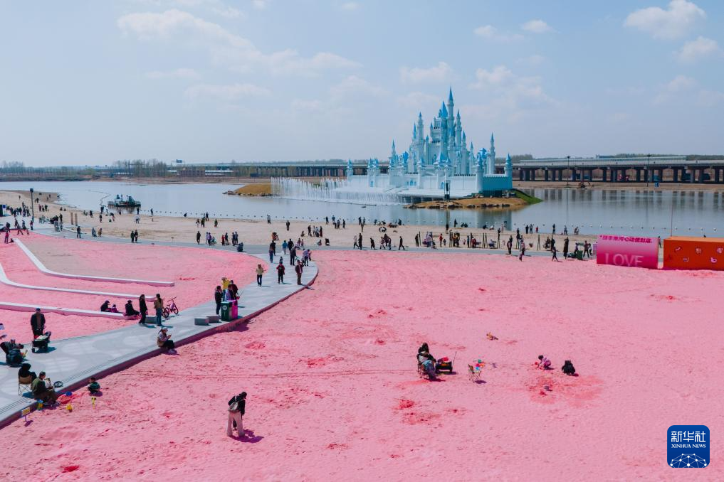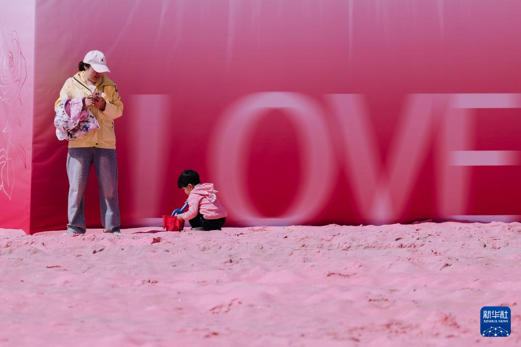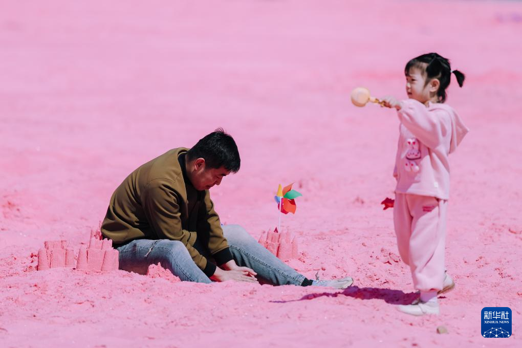 4月26日,市民在吉林省长春市肆季南河岸线公园的粉色沙滩上陪伴孩子搭建“沙子城堡”。