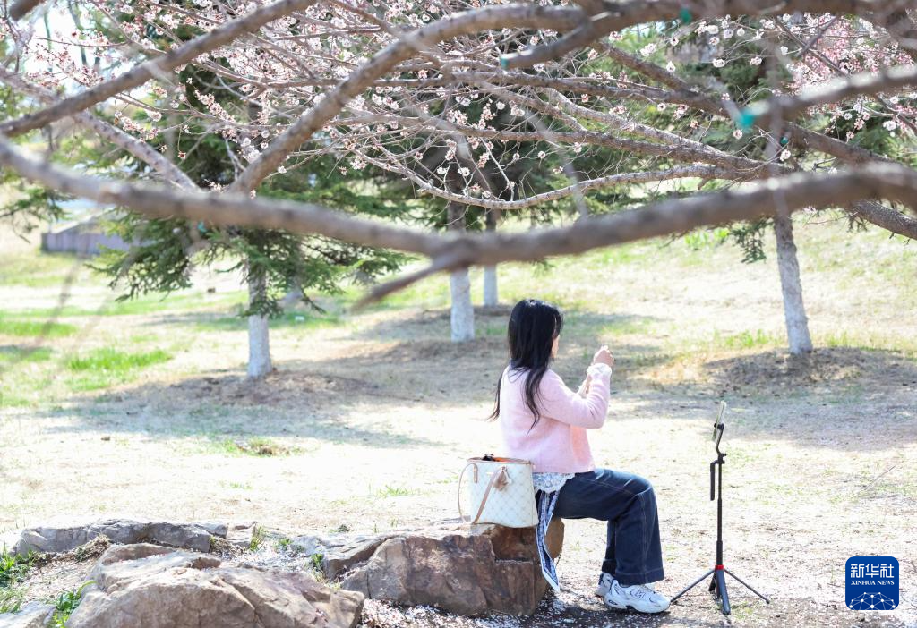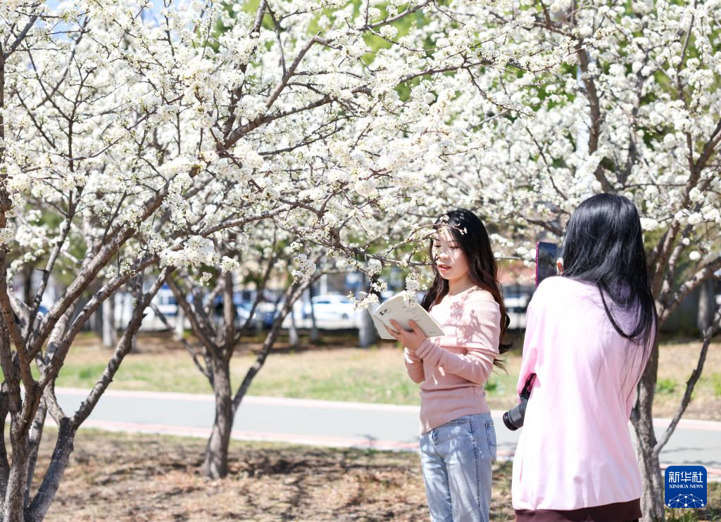 4月26日,市民在吉林省长春市伊通河畔拍照。