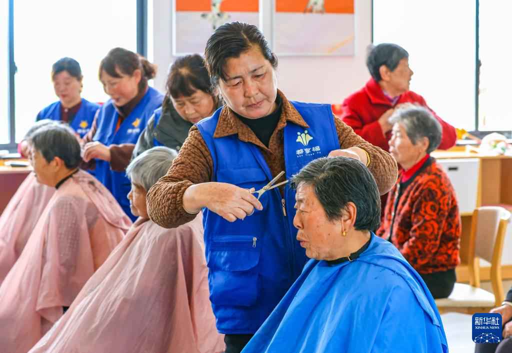 4月29日,在扬州市江都区丁伙镇延庆村党群服务中心,“都享福”志愿者为老人理发。