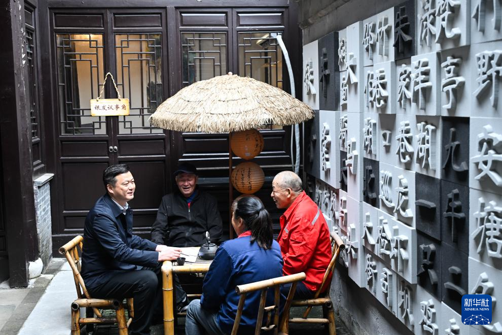4月29日,在扬州市江都区邵伯镇甘棠社区老街工作室银发议事角,社区干部(左一)了解老年居民的生活状态。