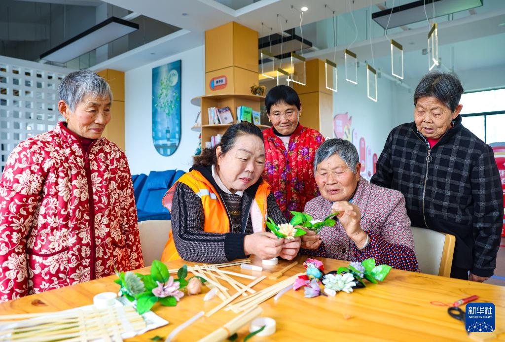 4月29日,在扬州市江都区丁伙镇延庆村党群服务中心,“都享福”志愿者指导老人做手工。