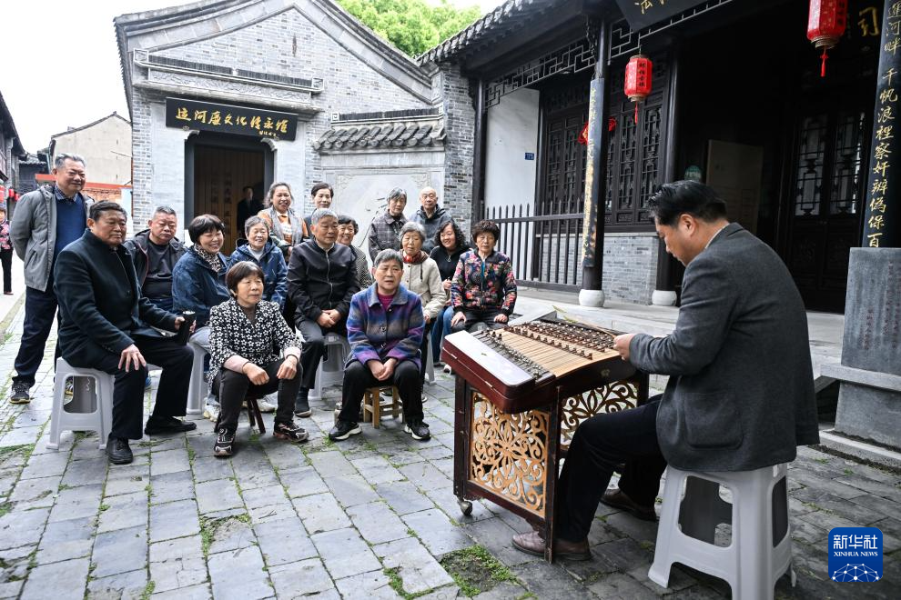 4月29日,在扬州市江都区邵伯镇甘棠社区,文化工作者给老年居民演奏扬琴。