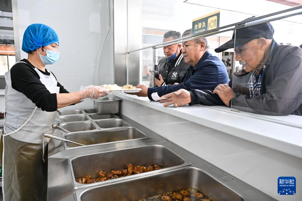 4月29日,在扬州市江都区邵伯镇甘棠社区幸福邻里食堂,工作人员为老年人打饭。