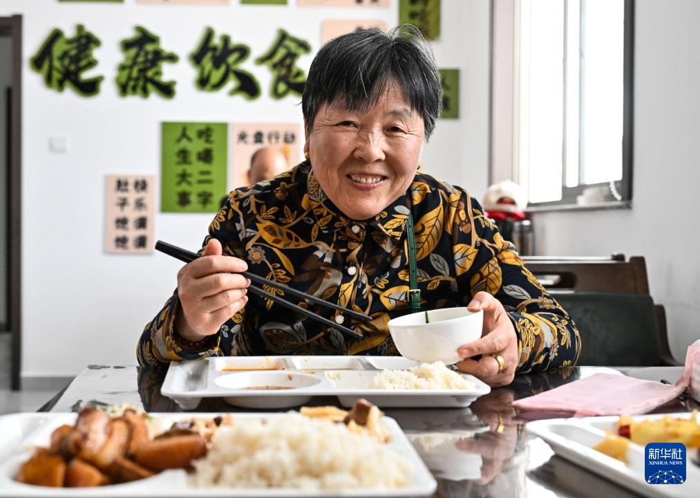 4月29日,老年居民在扬州市江都区邵伯镇甘棠社区幸福邻里食堂就餐。