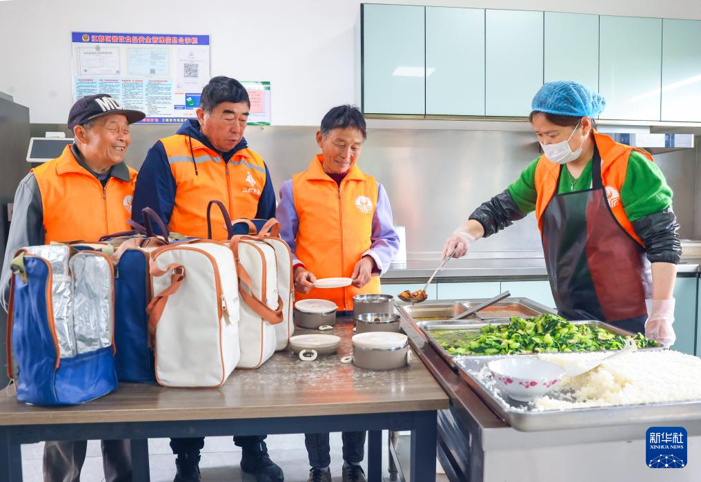 4月29日,在扬州市江都区丁伙镇延庆村党群服务中心,“都享福”志愿者准备将饭菜打包送给腿脚不便的老人。
