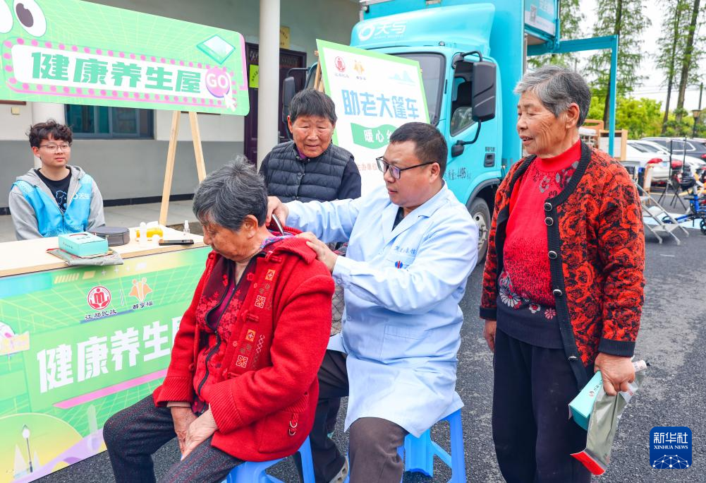 4月29日,在扬州市江都区丁伙镇延庆村党群服务中心,“都享福”志愿者为老人做健康保养。