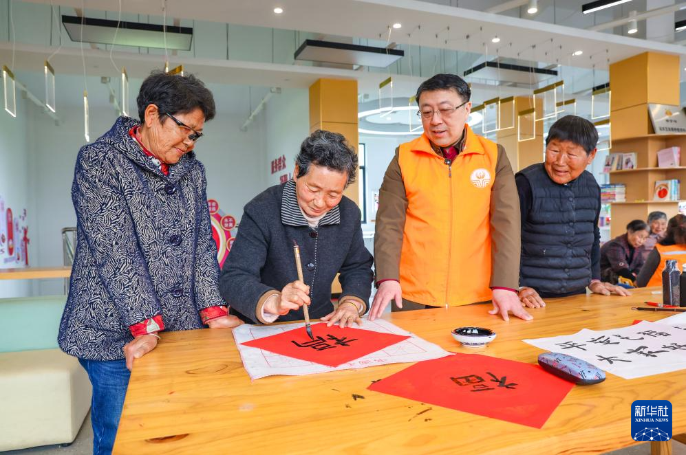 4月29日,在扬州市江都区丁伙镇延庆村党群服务中心,“都享福”志愿者指导老人书写毛笔字。