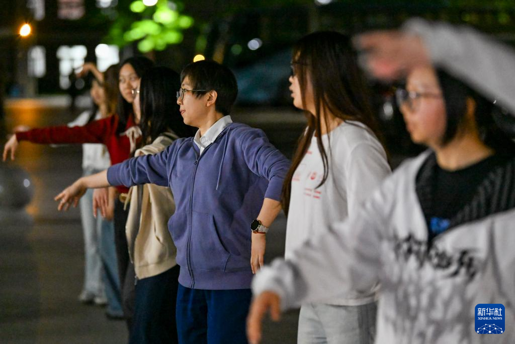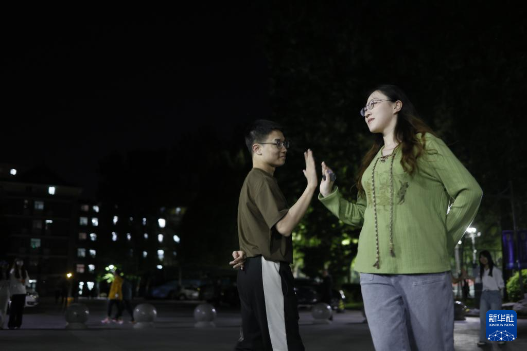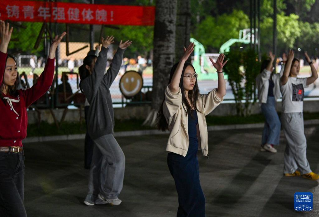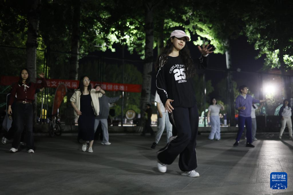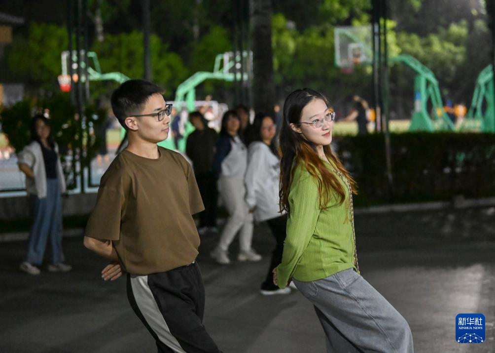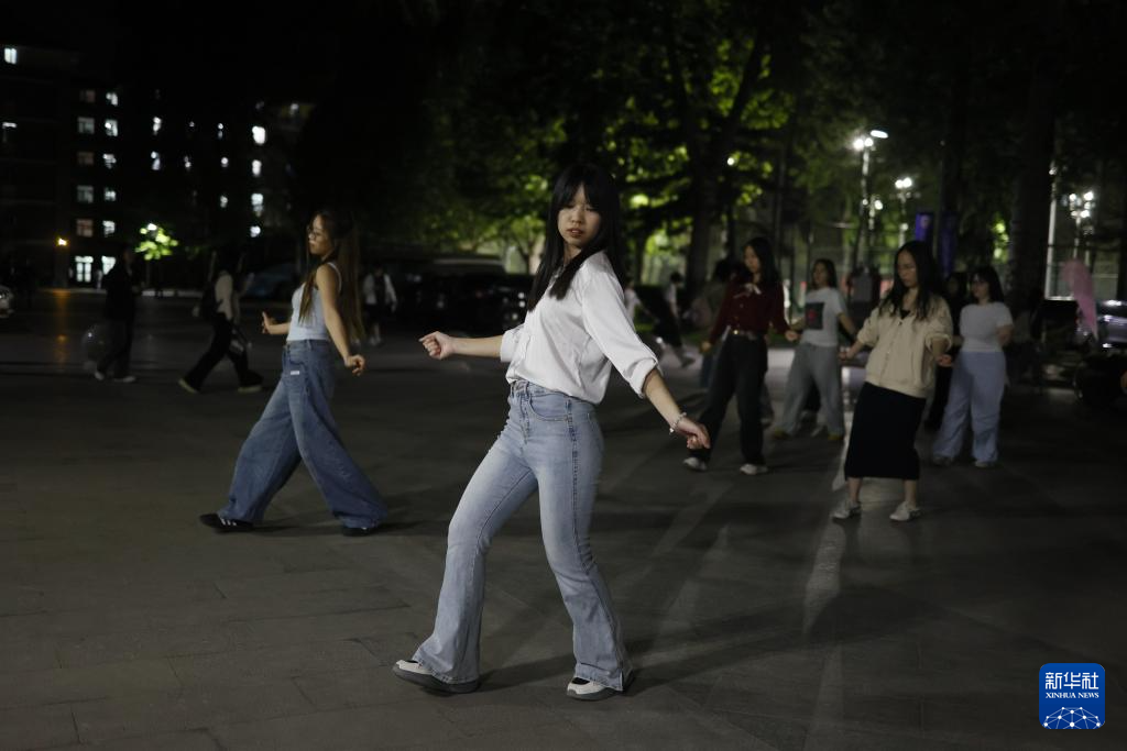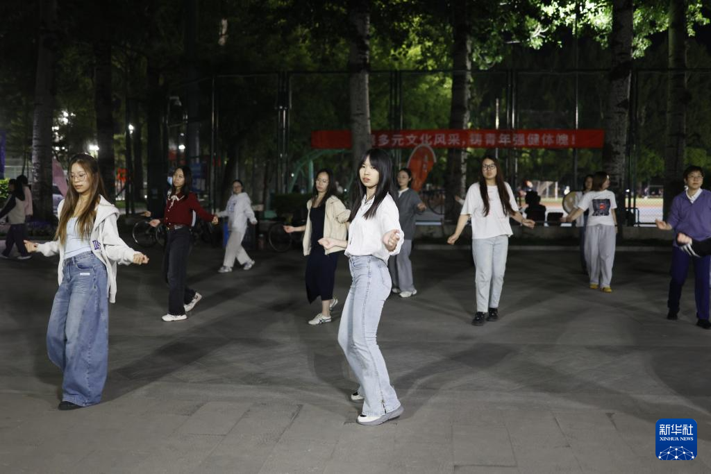 4月28日,人们在北京外国语大学内跳广场舞。在北京外国语大学,由学生和学校服务保障工作人员自发组建的广场舞队自2021年起已走过五个年头。最初,学生跟随在校内跳舞的叔叔阿姨一起跳。后来,广场舞在吸引了大量学生爱好者后被学生“接管”,如今已发展成为包含中外学生、毕业生、教师、学校服务保障工作人员的“大团队”,每晚准时开跳。学生表示,“跳起来根本不会去想那些烦心事”。