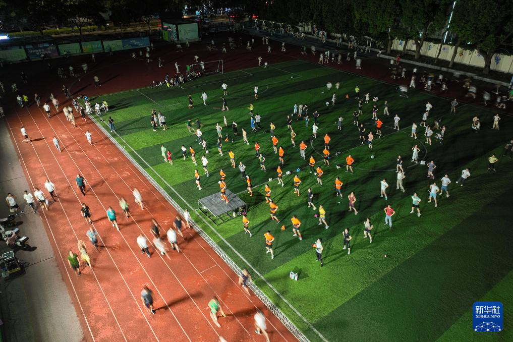 2023年8月8日,市民在浙江省湖州市全民健身中心跳广场舞(无人机照片)。