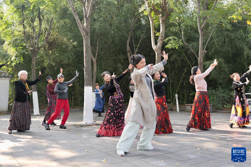 2025年10月28日,在江苏省徐州市汉文化景区,来自淮北师范大学的学生与老年艺术团即兴共舞。