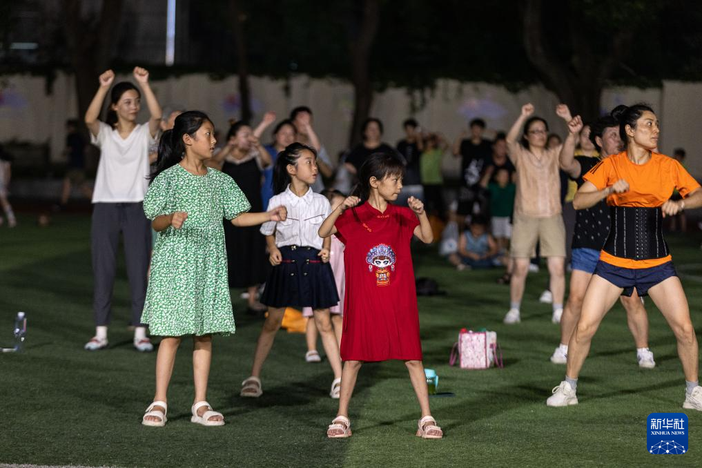 2023年8月8日,在浙江省湖州市全民健身中心,小朋友在学跳广场舞。