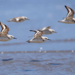一群三趾滨鹬在闽江河口湿地水面上空飞翔(4月19日摄)。