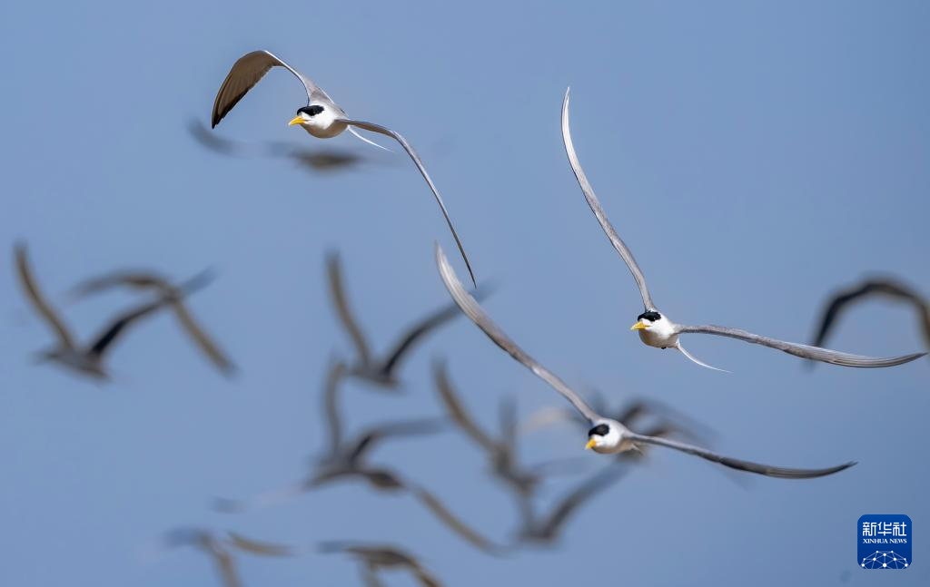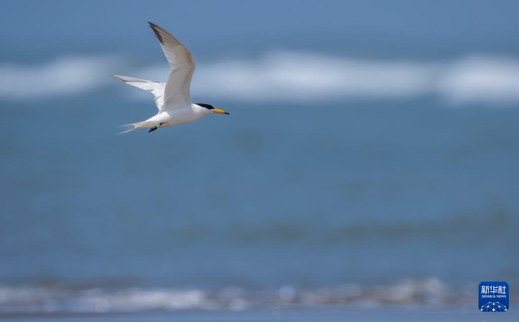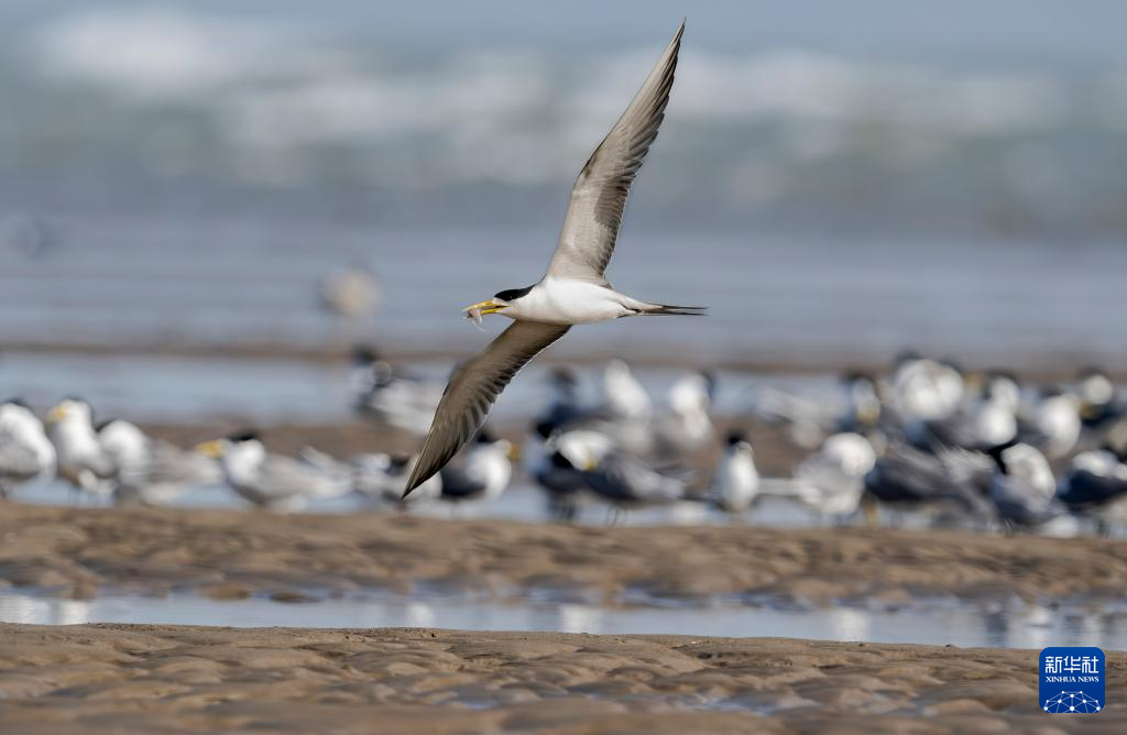 国家二级保护野生动物大凤头燕鸥在闽江河口湿地上空飞翔(4月26日摄)。