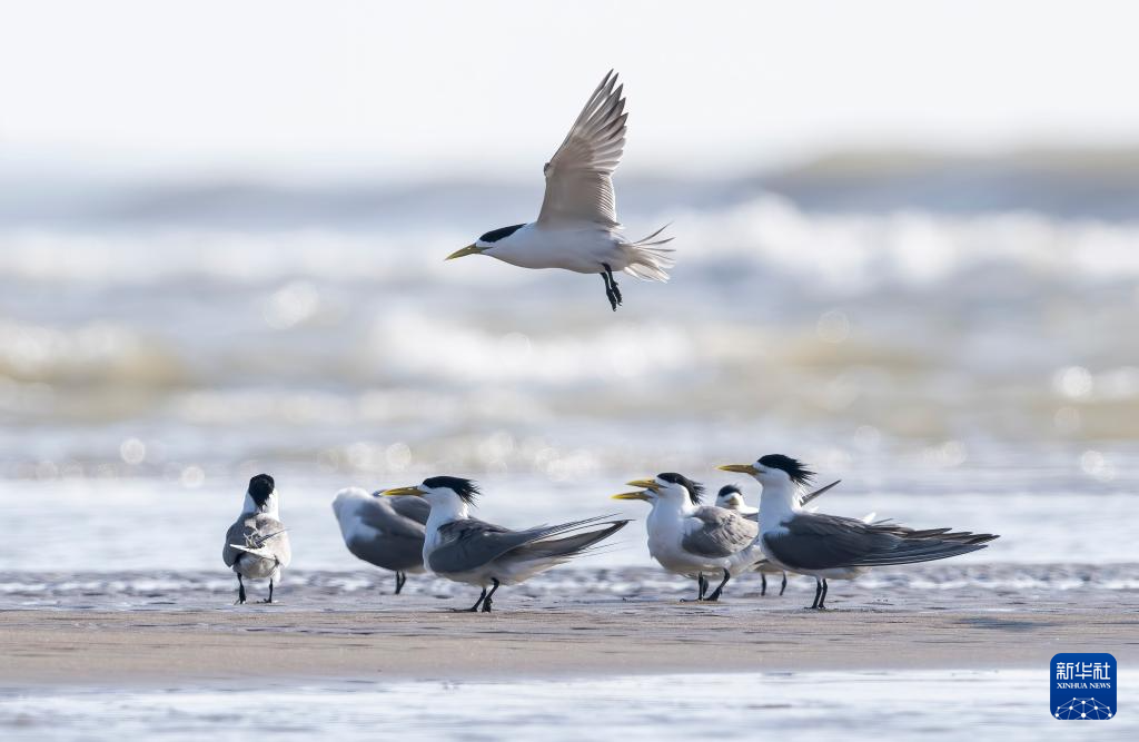 国家二级保护野生动物大凤头燕鸥在闽江河口湿地沙滩上停歇(4月26日摄)。