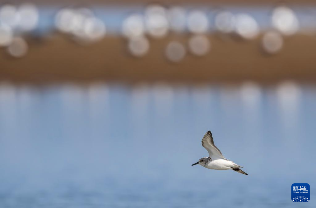 一只水鸟在闽江河口湿地上空飞翔(4月26日摄)。