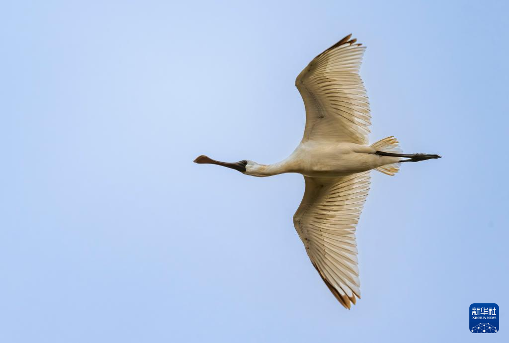 一只国家一级保护野生动物黑脸琵鹭在闽江河口湿地上空翱翔(4月29日摄)。
