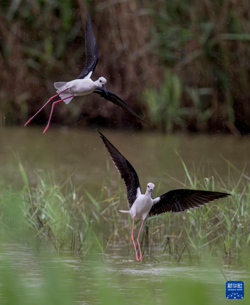 两只黑翅长脚鹬在闽江河口湿地打斗嬉戏(4月29日摄)。