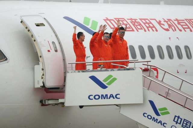 C919客机完成首飞,在上海浦东国际机场着陆后,首飞机组人员走出机舱向观礼嘉宾挥手致意。