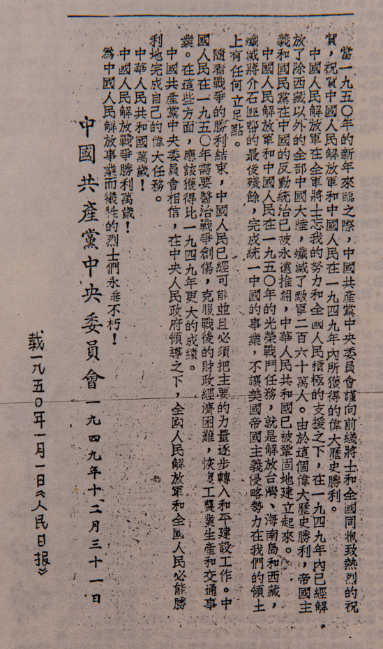 于是就出现了这份振奋人心的档案。新华社1949年12月31日电,中国共产党中央委员会发表了《告前线将士和全国同胞书》:欢庆1949年所获得的伟大历史胜利,提出1950年光荣的战斗与生产任务。