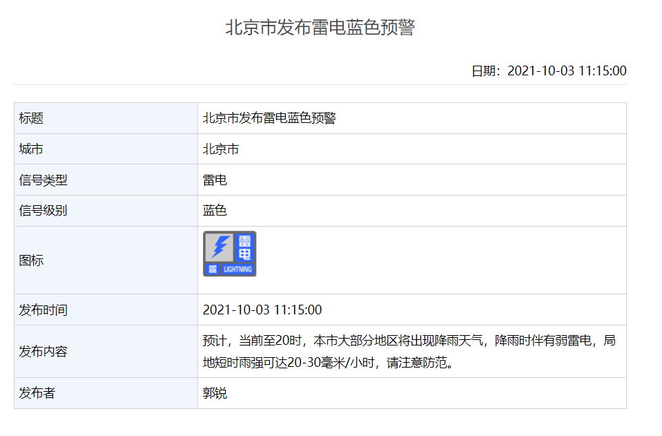 北京发布雷电蓝色预警:大部分地区将降雨并伴有弱雷电