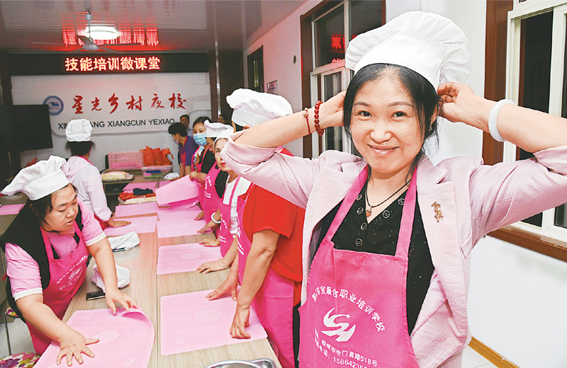 2021年以来,青岛胶州市先后在24个乡村(社区)扶持打造了35个村级夜校,开设育婴师、面点师、电焊工等“接地气”的培训课程,帮助村民丰富精神文化生活、提高创业致富技能水平。图为2021年8月31日,村民在夜校学习中式面点制作。 新华社记者 李紫恒/摄