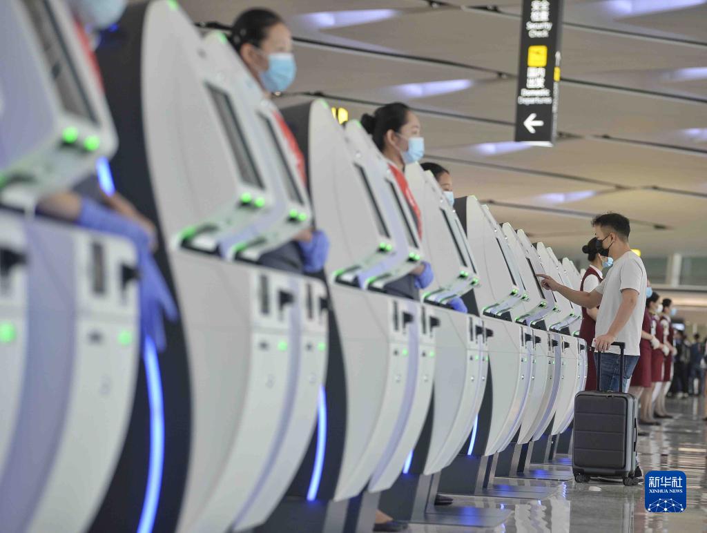 旅客在成都天府国际机场T2航站楼办理自助值机(6月27日摄)。新华社记者 刘坤 摄