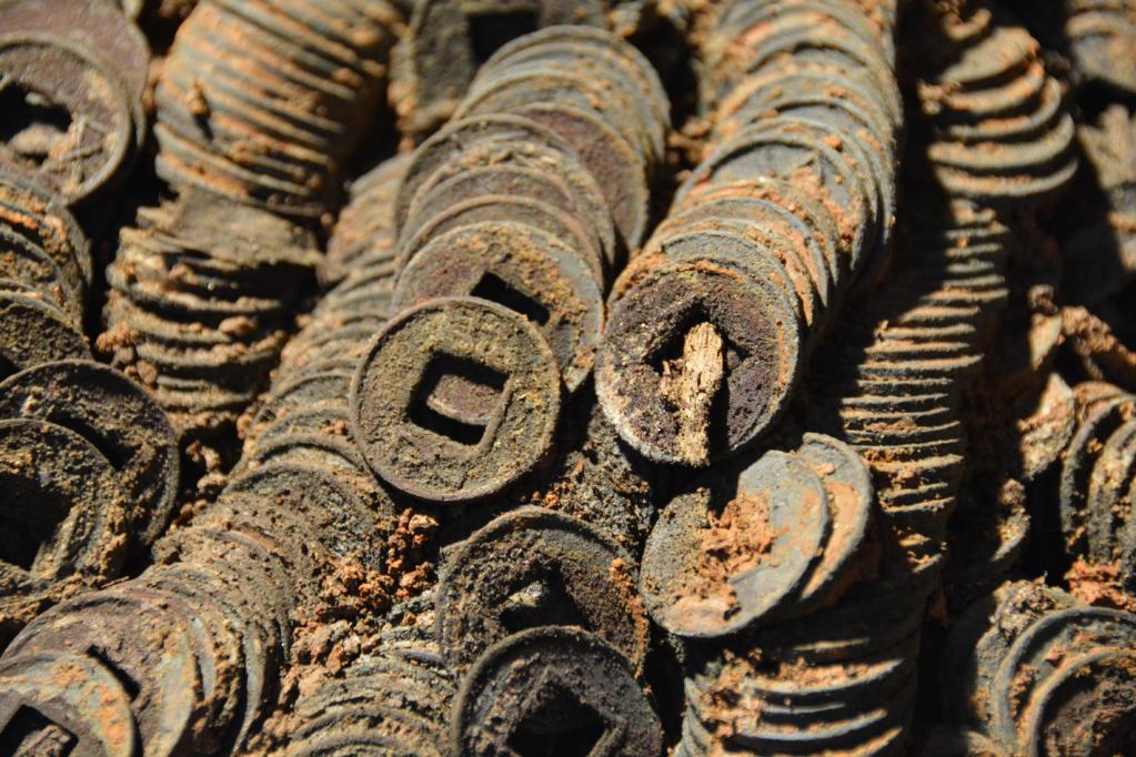 海昏侯刘贺墓北藏椁的钱库中出土的五铢钱。(江西省文物考古研究院提供)