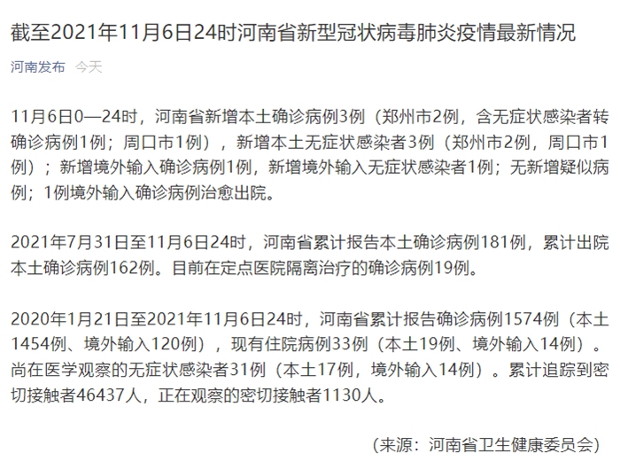 2020年1月21日至2021年11月6日24时,河南省累计报告确诊病例1574例(本土1454例、境外输入120例),现有住院病例33例(本土19例、境外输入14例)。尚在医学观察的无症状感染者31例(本土17例,境外输入14例)。累计追踪到密切接触者46437人,正在观察的密切接触者1130人。